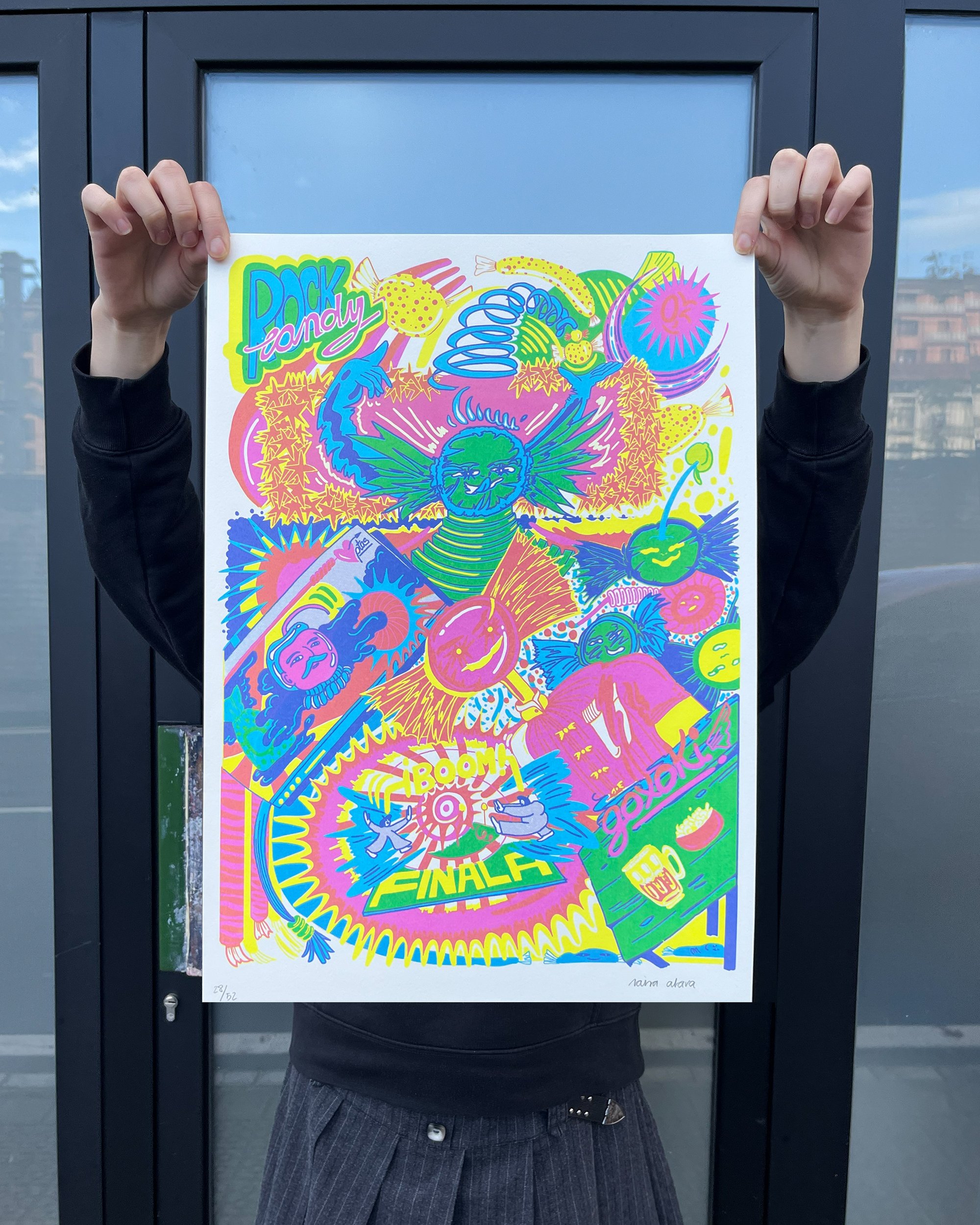 Serigrafía estampada a mano con el diseño "Goxoki" de raisa Alava para la exposición Txutxe Denda en el taller.